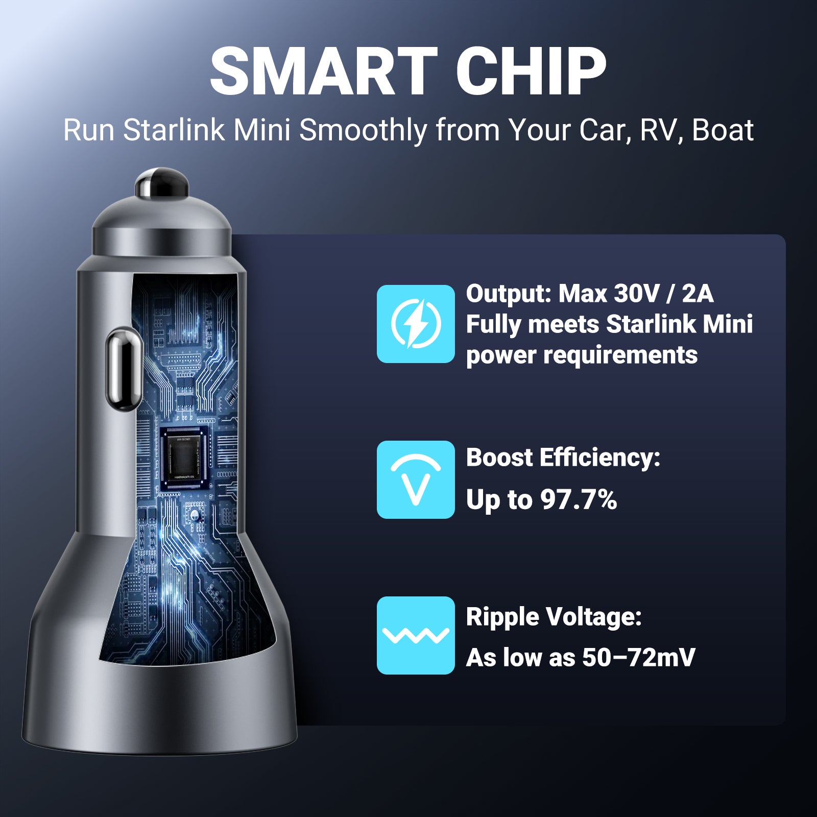 - STABLE 30V OUTPUT FOR STARLINK MINI - This Starlink Mini power cable features a built-in boost converter that converts the 12V-24V input from your vehicle's cigarette lighter into a reliable DC output of 30V/2A (60W max). It ensures smooth and smooth operation of Starlink mini-kits on the go, making it an indispensable power solution for RVs, trucks and travel.